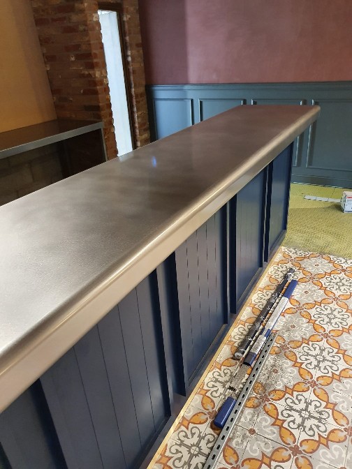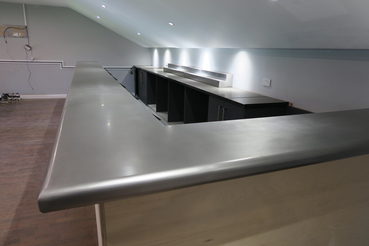 Stainless steel remains ever popular with its durability and robustness creating a classy look to any bar. Welds can be polished out to make the top appear seamless and in one piece, and although grained is the traditional finish, it can also be distressed which then makes the look, very similar to a zinc top but at a fraction of the cost of zinc.