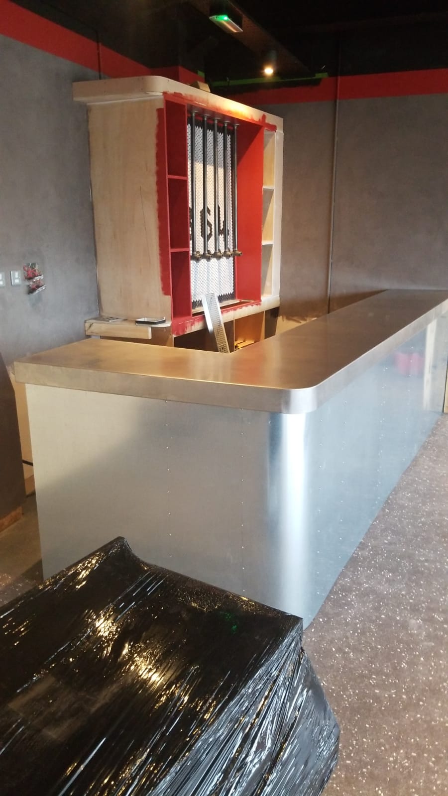 We pride ourselves on the bar tops finished look, and key to this primarily is the flatness of the top, which we believe is best achieved in the workshop where the top can be bonded properly, and clamped to the timber substrate, and where welded joints can be polished out to a very high standard to achieve that seamless appearance.